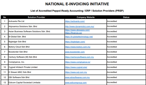 - Peppol-Ready Solution Providers (PRSP): Ini merangkumi perisian perakaunan dan sistem ERP yang menyediakan fungsi penghantaran dan penerimaan e-invois tanpa menjadi titik capaian (Access Point) sepenuhnya.