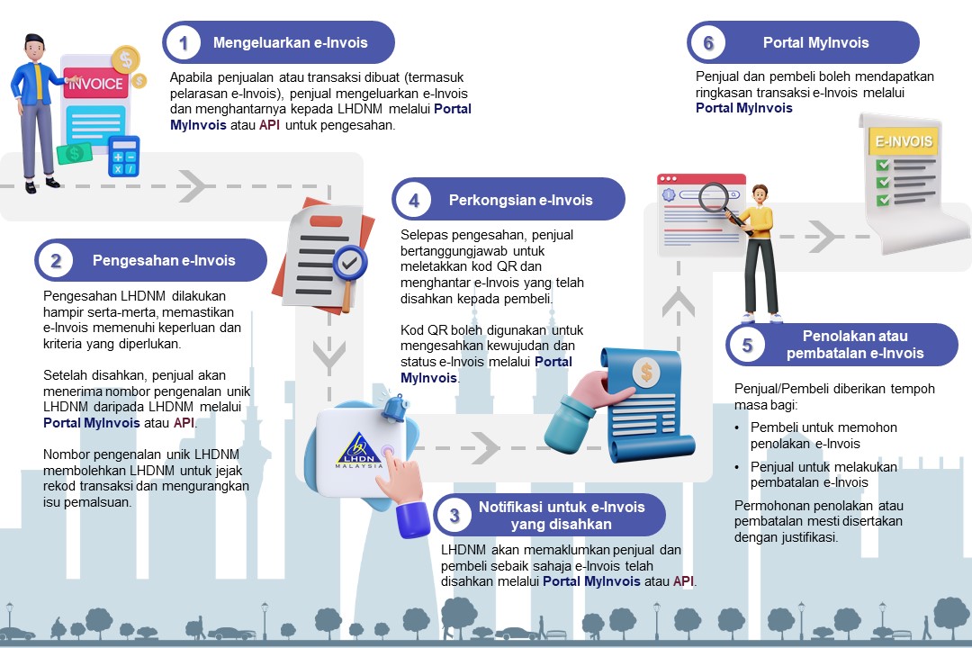 Setiap invois mesti dihantar kepada LHDN untuk diluluskan dan disahkan oleh Lembaga Hasil Dalam Negeri (LHDN) sebelum ia boleh dicetak sebagai invois yang disahkan untuk pelanggan anda. Pengesahan oleh LHDN merangkumi pemeriksaan Nombor Pengenalan Cukai (TIN) dan struktur/format data e-invois. Selepas e-invois disahkan, pembekal diwajibkan untuk berkongsi e-invois yang telah diluluskan dengan pembeli selepas menyertakan pautan pengesahan (yang diberikan oleh LHDN) dalam bentuk kod QR pada e-invois. Kod QR ini boleh digunakan untuk mengesahkan kewujudan dan status e-invois melalui Portal MyInvois. Dalam erti kata yang mudah, sebelum invois diberikan kepada pelanggan, invois tersebut perlu dihantar ke LHDN terlebih dahulu. Boleh rujuk rajah dibawah untuk lebih jelas.